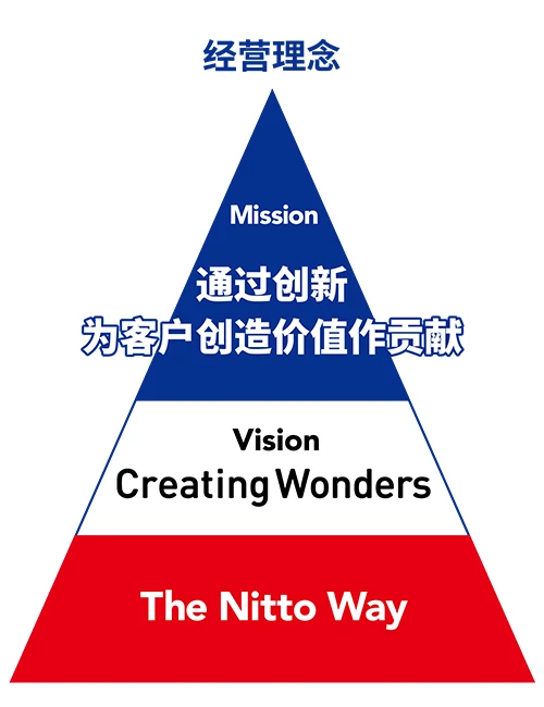 自日东集团成立以来,那些早于我们的日东员工所拥有的认真的愿望、智慧和价值经过长期的积累已成为“日东DNA”,并被新一代员工传承下来。以公司法定形式列出这些DNA,“基础思维”提供给我们行为标准和情感支柱。