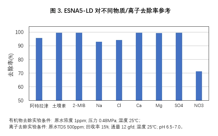 ESNA5-LD对于水中的各类有机污染物拥有优异的去除效果,同时能有效降低水中的硬度、硫酸盐、硝酸盐等无机离子含量,产水水质满足新国标标准,实现从 “合格供水”到 “高品质供水”的跨越。