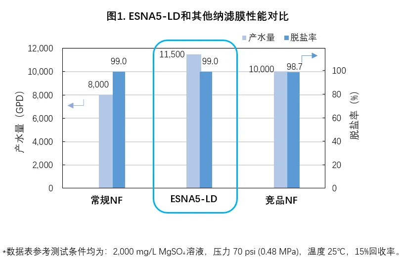 ESNA5-LD膜元件采用高通量新型膜片及新型宽流道隔网技术,较市场同类产品透水特性提高15%以上,在拥有高达11,500m3/d产水量的同时,拥有≥99.0%的高脱盐率,相比常规纳滤膜元件更加高效、节能。