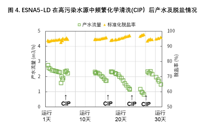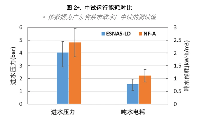 参考某水厂中试实验结果,在相同设定通量的前提下,较市场同类优秀产品而言,ESNA5-LD的硬度去除率更高,且运行能耗可降低约30%,能够为客户节省可观的制水成本。