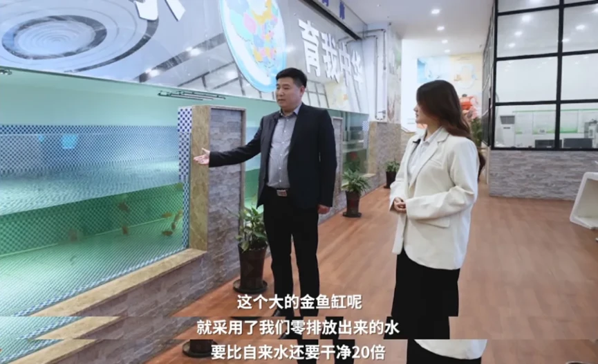 在吴氏印染厂吴正新董事长热情地引领下,我们一行人来到了印染厂的ZLD系统车间。一个意想不到的景象吸引了所有人的目光。数尾金鱼悠然自得地游弋在清澈透亮的大鱼缸里,向我们展示着自然生命与工业制造的和谐场景。